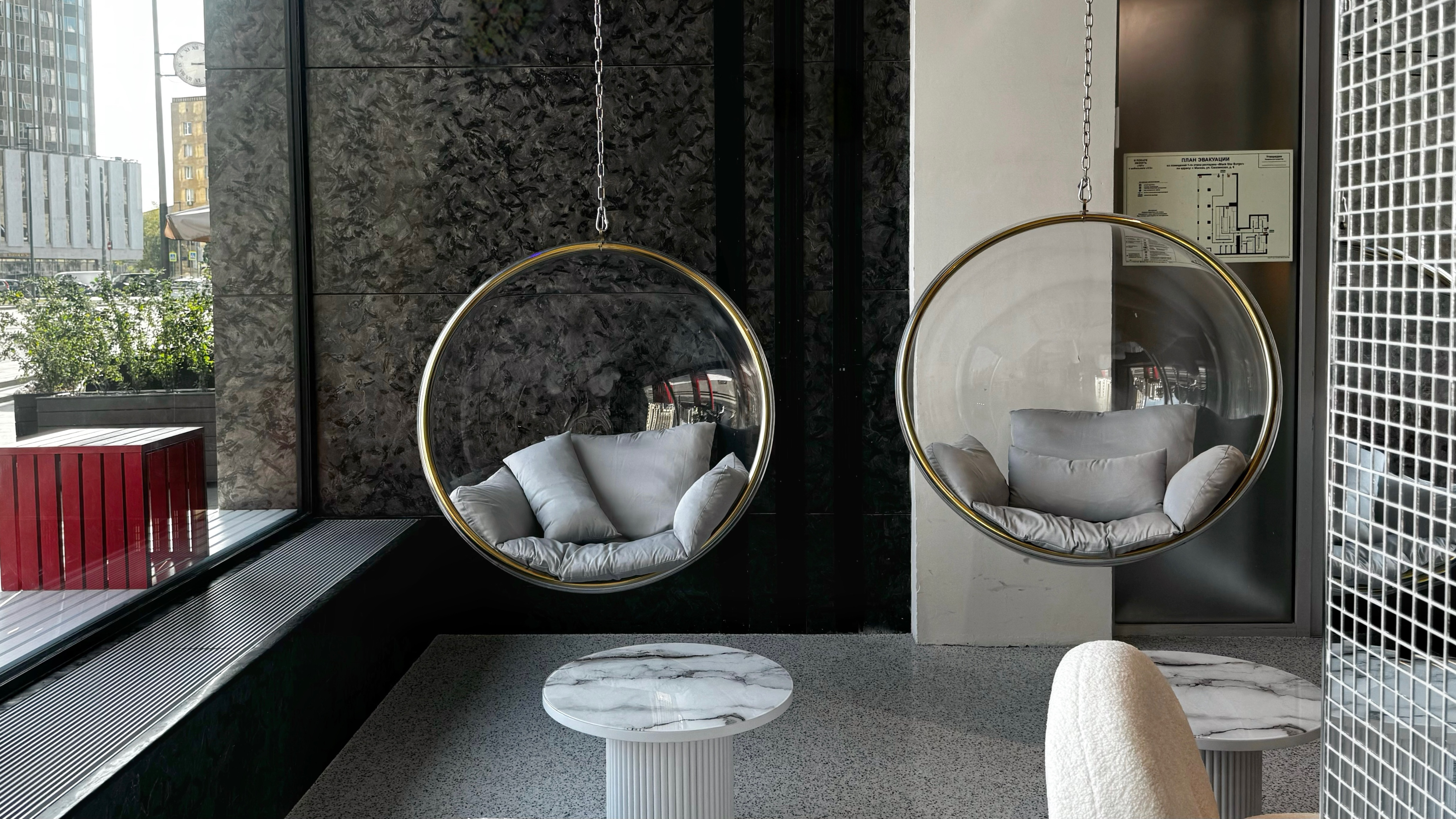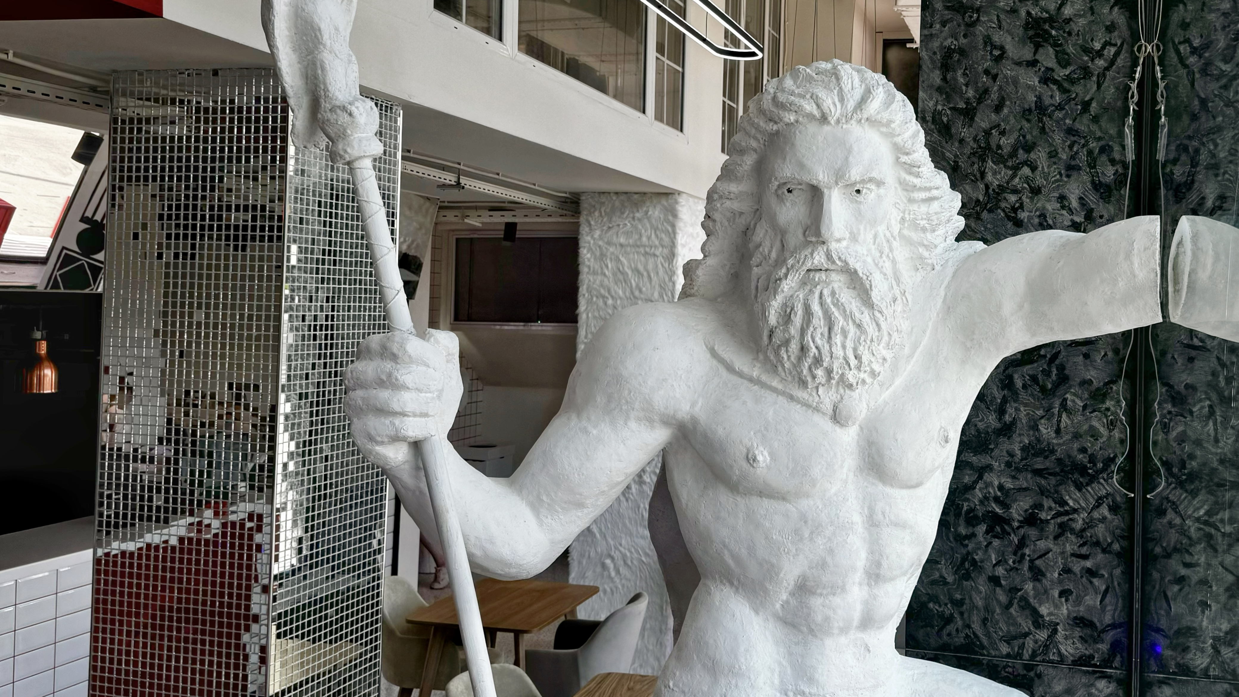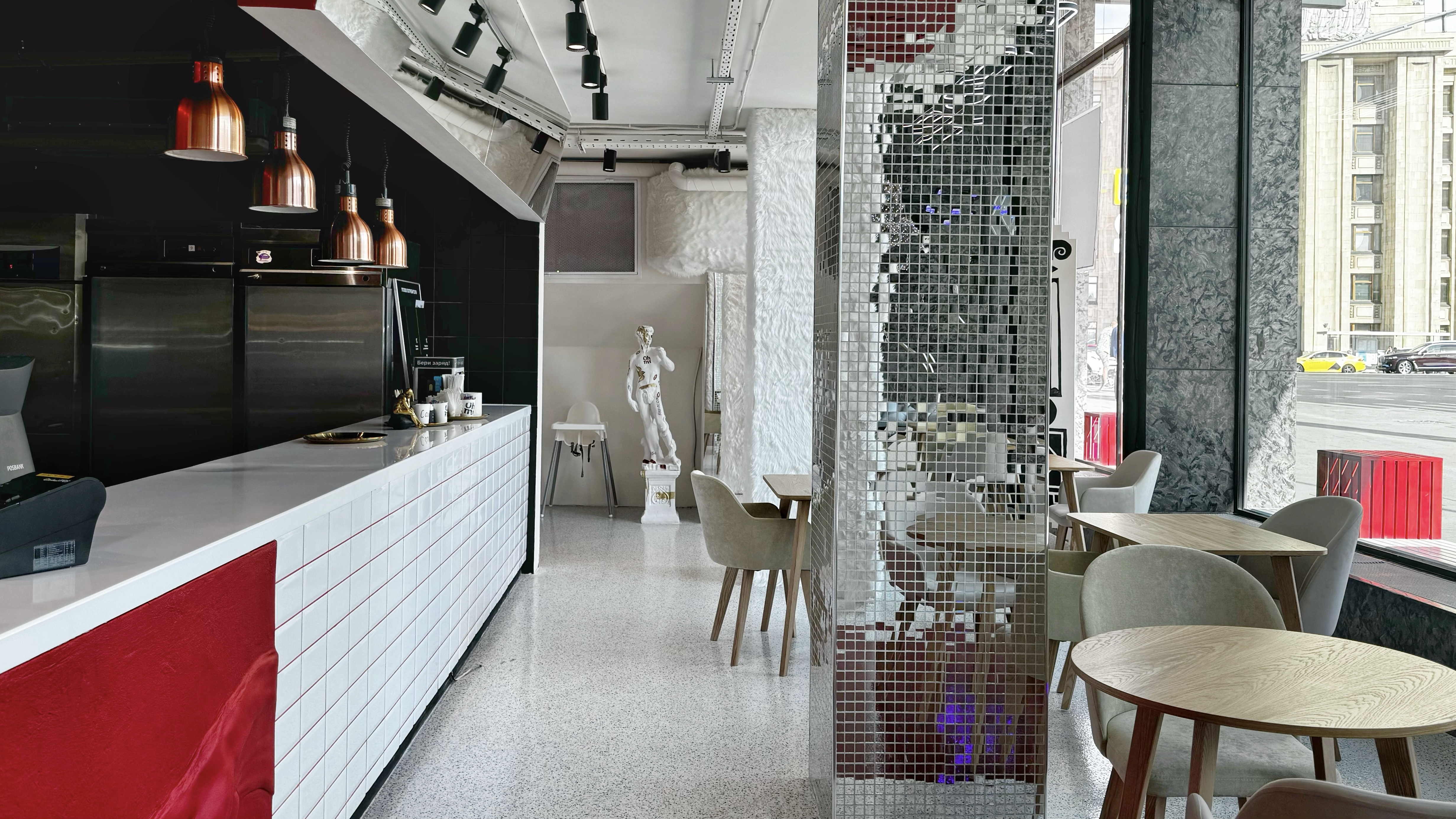 It's called oh my toast, located on Smolenskaya, 6. The design is ultra stylish and unusual: fur columns, a relaxation area with swings that children love, and the main exhibit: a huge statue of Zeus breaking through glass.