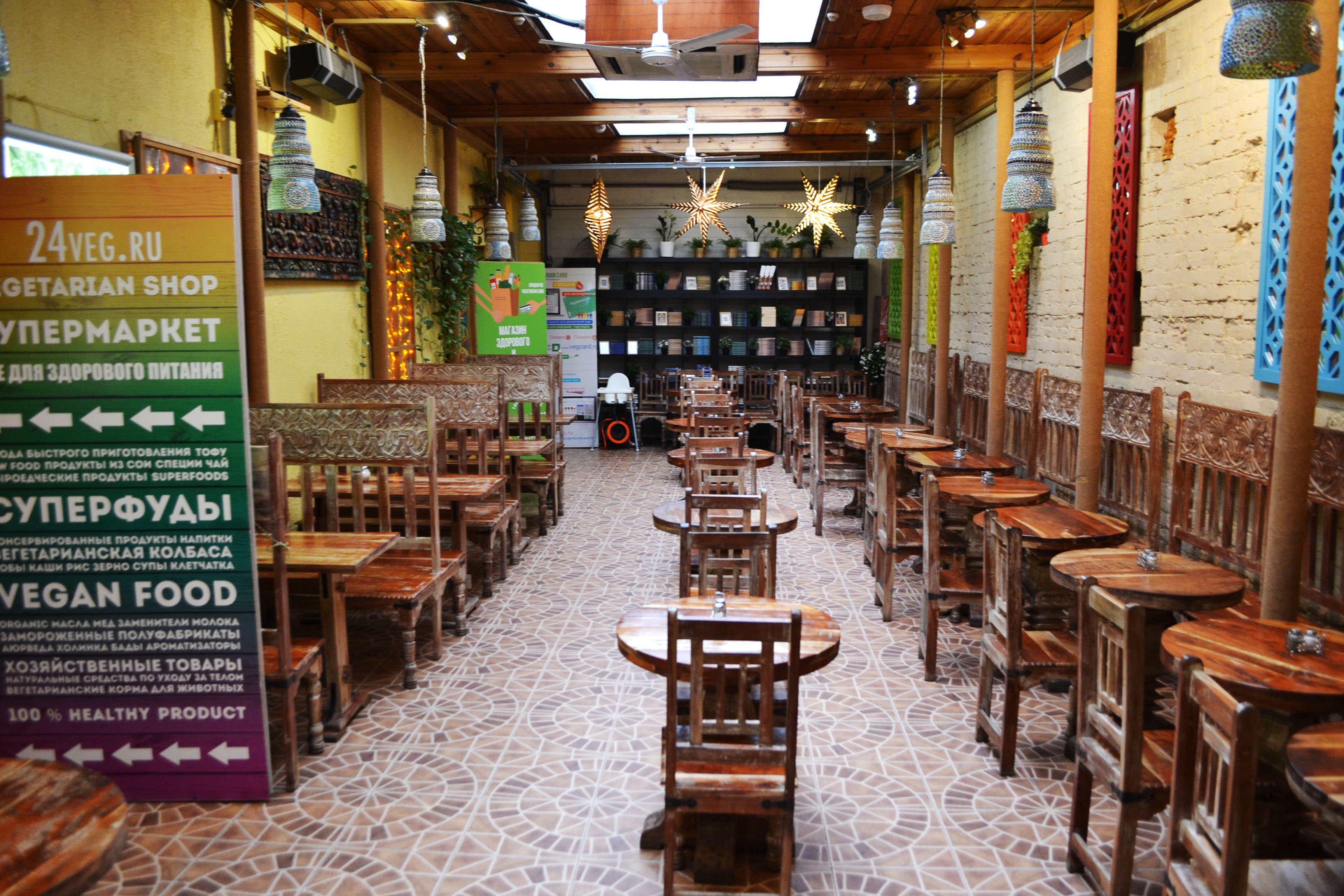 Приобретайте полезные продукты с собой. Кроме вкусной и полезной кухни, в каждом из наших кафе есть магазин с вегетарианскими и диетическими продуктами, среди которых – всевозможные крупы, морская капуста, полезные макароны, тофу, продукты из сейтана и сои, индийские специи и закуски, а также зерна для проращивания и многое, многое другое.