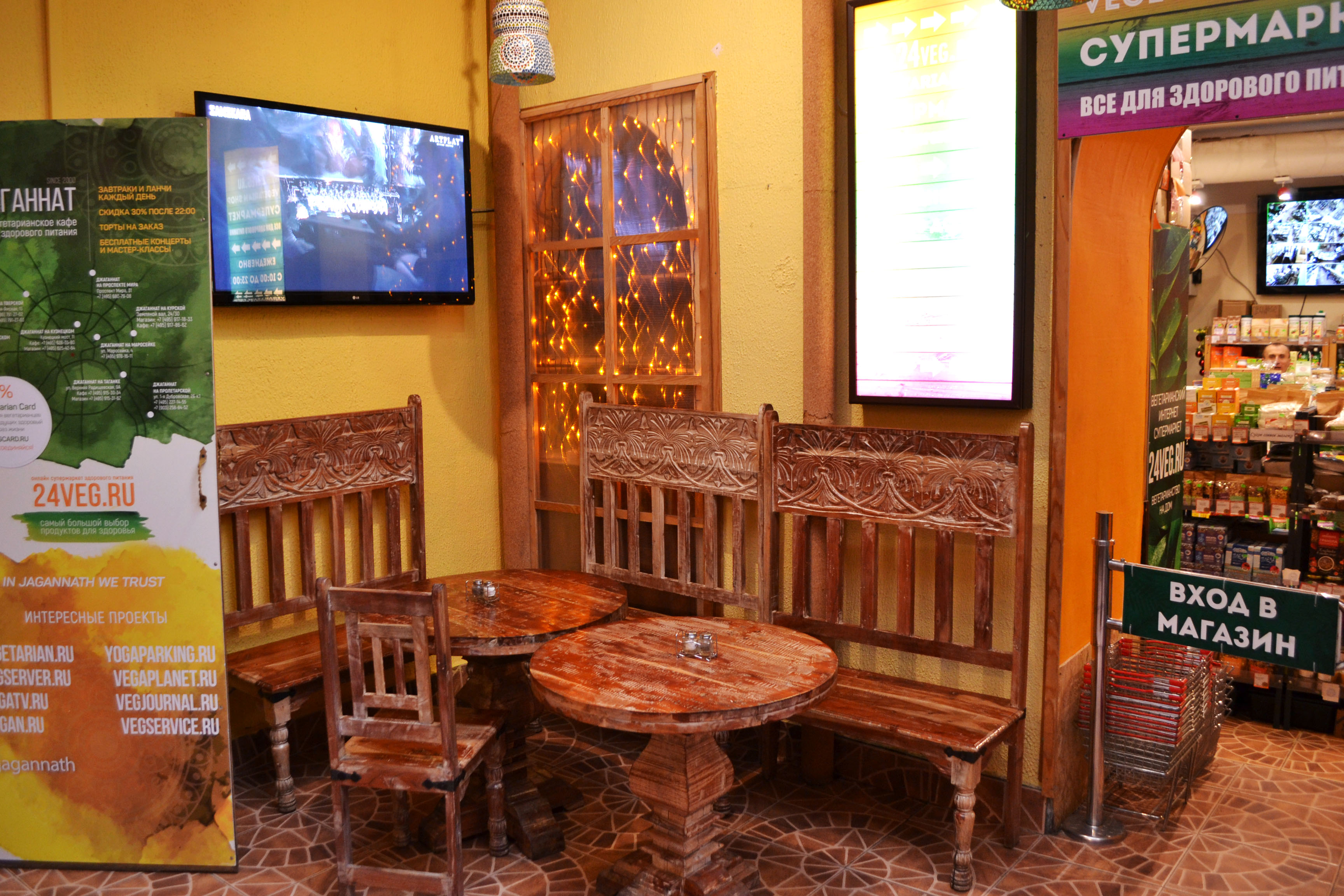 Кафе «Джаганнат» – уютное место для ценителей вегетарианской кухни и всех, кто любит оригинальные и экзотические блюда. Посетить наши кафе можно в шести разных местах столицы: недалеко от станций метро Китай-город, Курская, Таганская, Кузнецкий мост, Маяковская и Проспект мира. Кроме того, в каждом кафе есть магазин здорового питания (а на Пролетарской и в Крылатском - отдельные магазины).Кухня «Джаганнат» – международная, воплощающая традиции Индии, Европы, Таиланда, Мексики и Китая. Здесь вы найдете интересное общение, яркие вкусы и пропитанное духом Востока настроение.