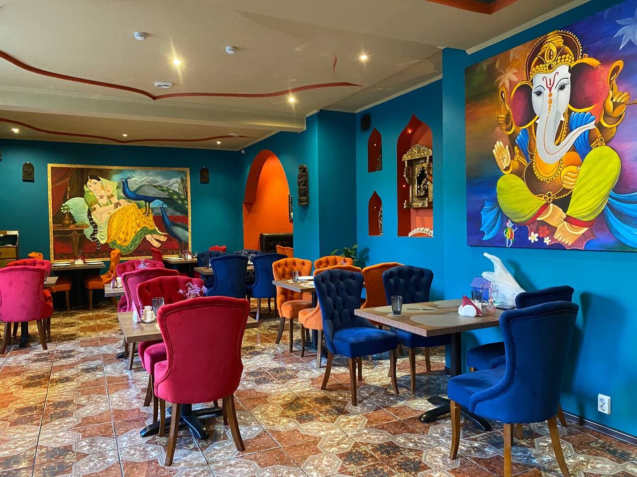 Интерьер ресторана оформлен в ярких цветах. Разнообразие красок формирует сложный, насыщенный колорит из красных, оранжевых, синих и голубых тонов. Их дополняют вариации из деревянных, золотых и бронзовых акцентов в виде статуэток.