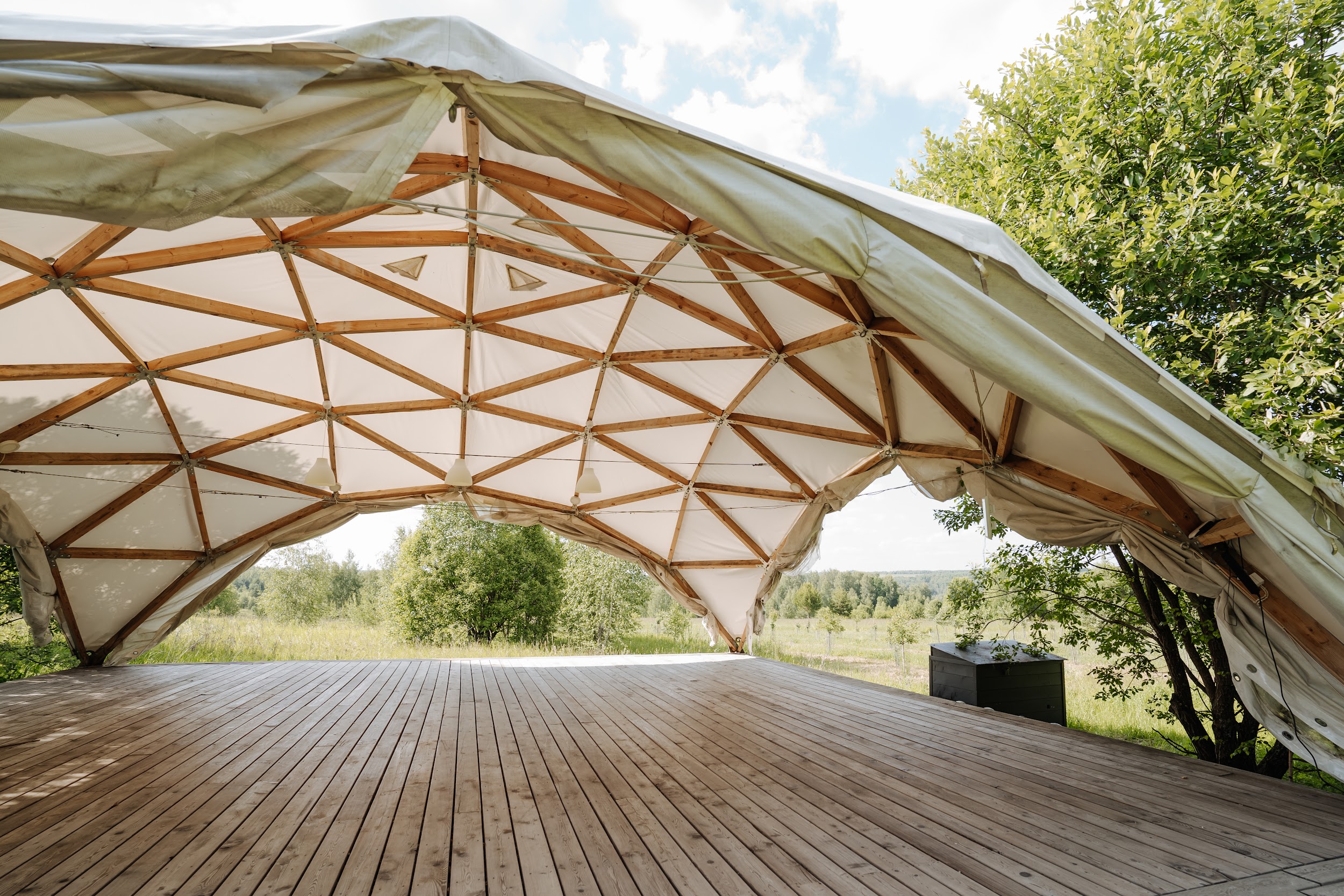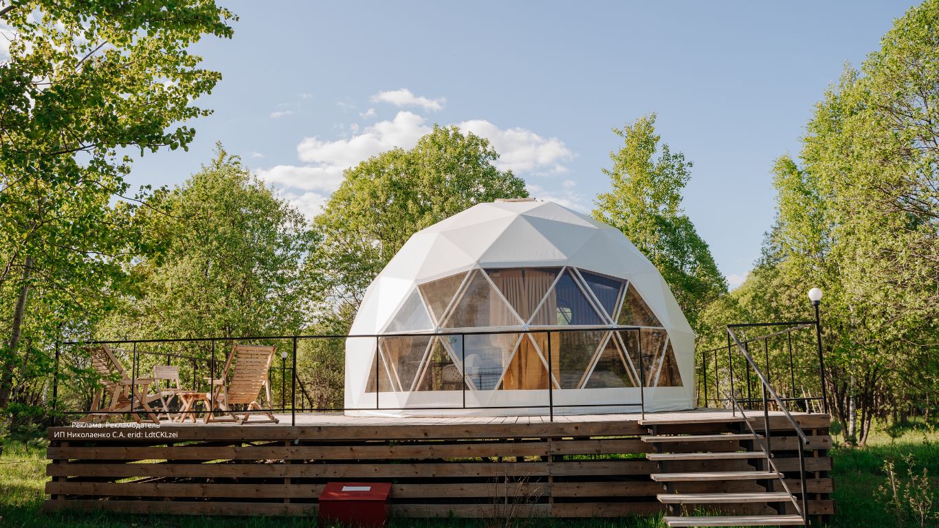 Купольный дом органично вписан в пространство экопарка, имеет окна с панорамным видом на лес и террасой, на которой оборудована зона для отдыха со столиком, шезлонгами и гамаком.