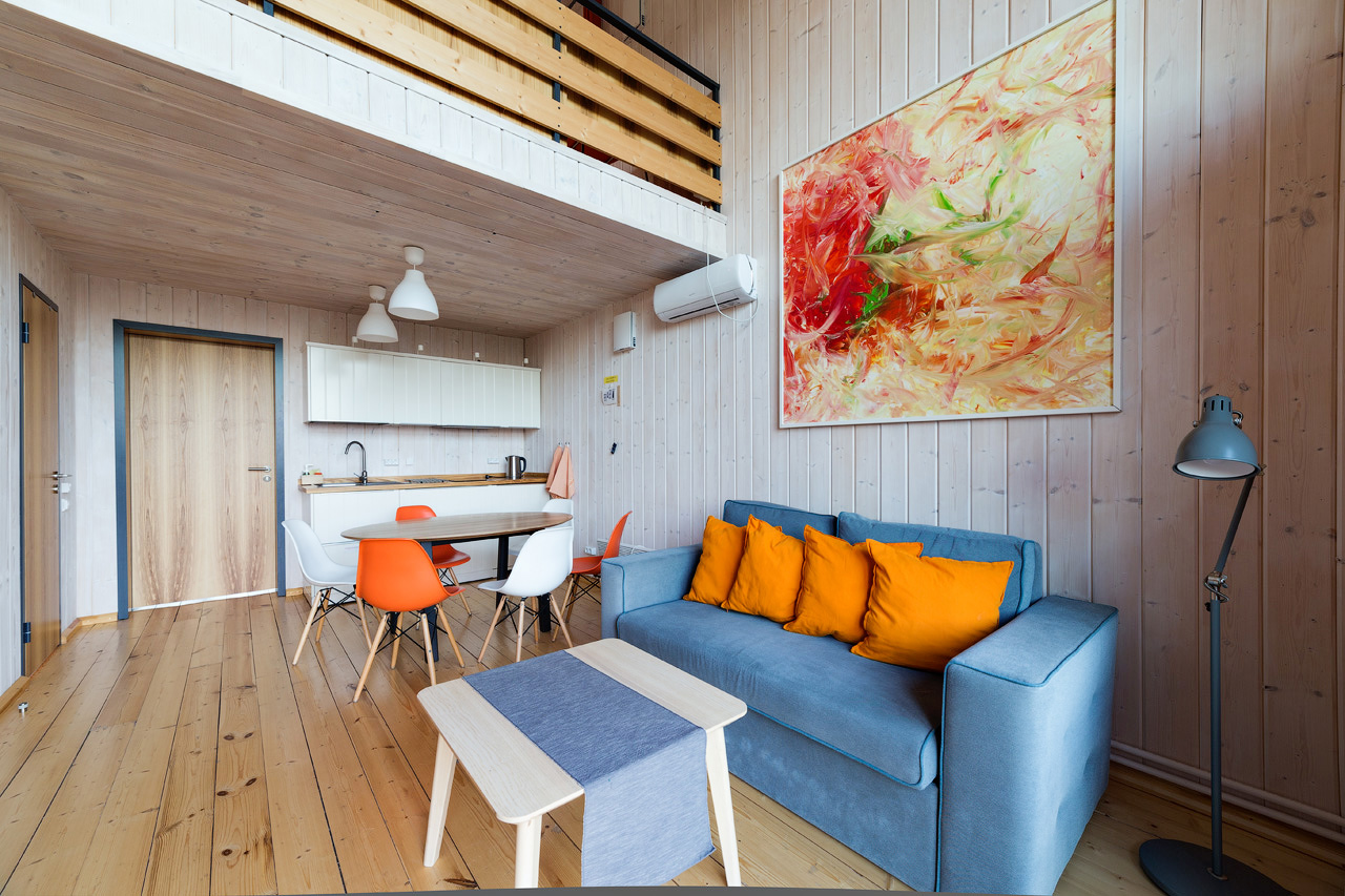 Дом-Ковчег – это 10 номеров коридорного типа. В общей сложности Ковчег рассчитан на проживание 52 человек. Все номера выполнены в дереве. Внутри есть два больших зала для занятий, соединенных зоной чилл-аут с детской игровой. Залы оснащены звуковым оборудованием, проектором с экраном.