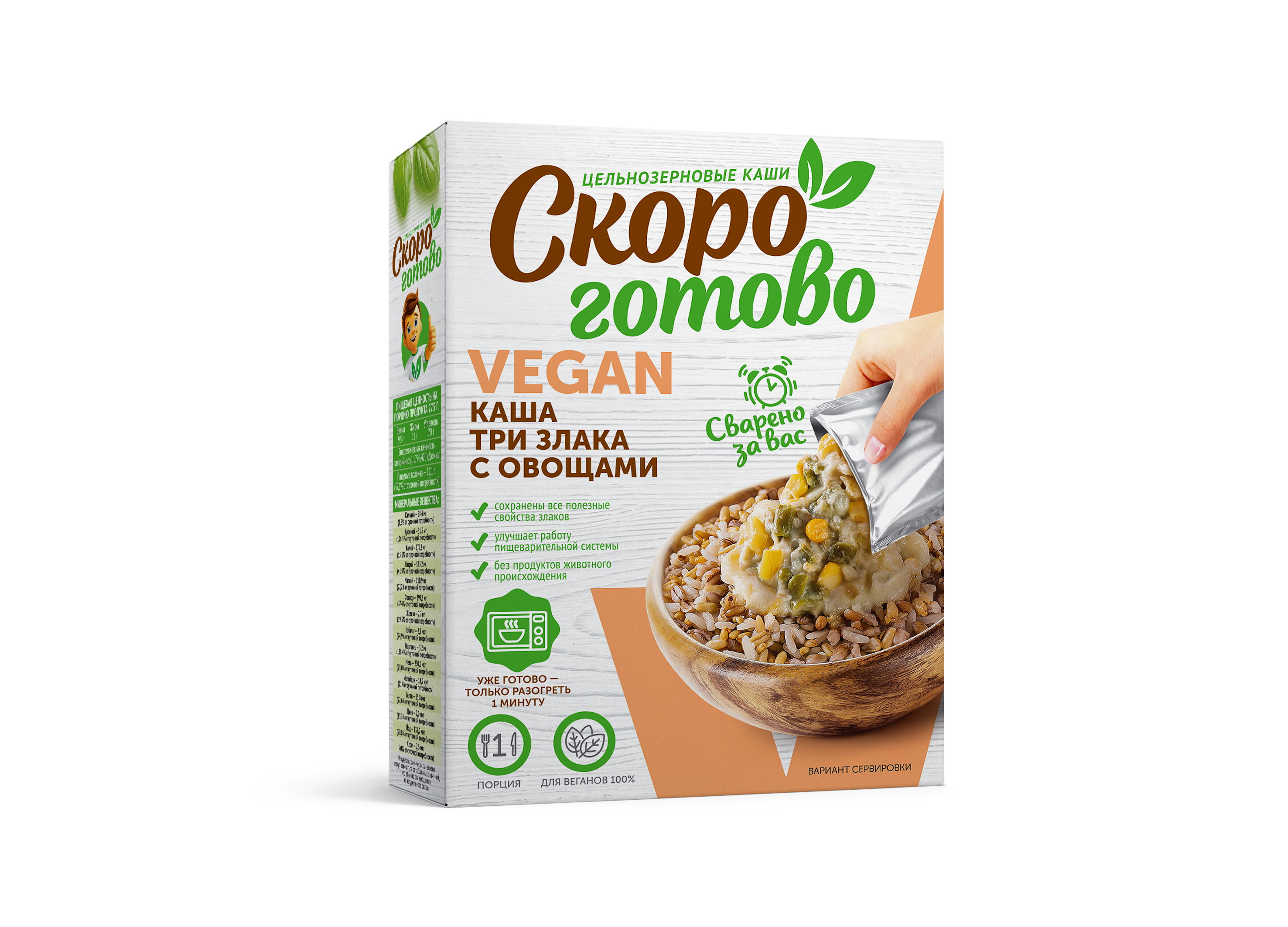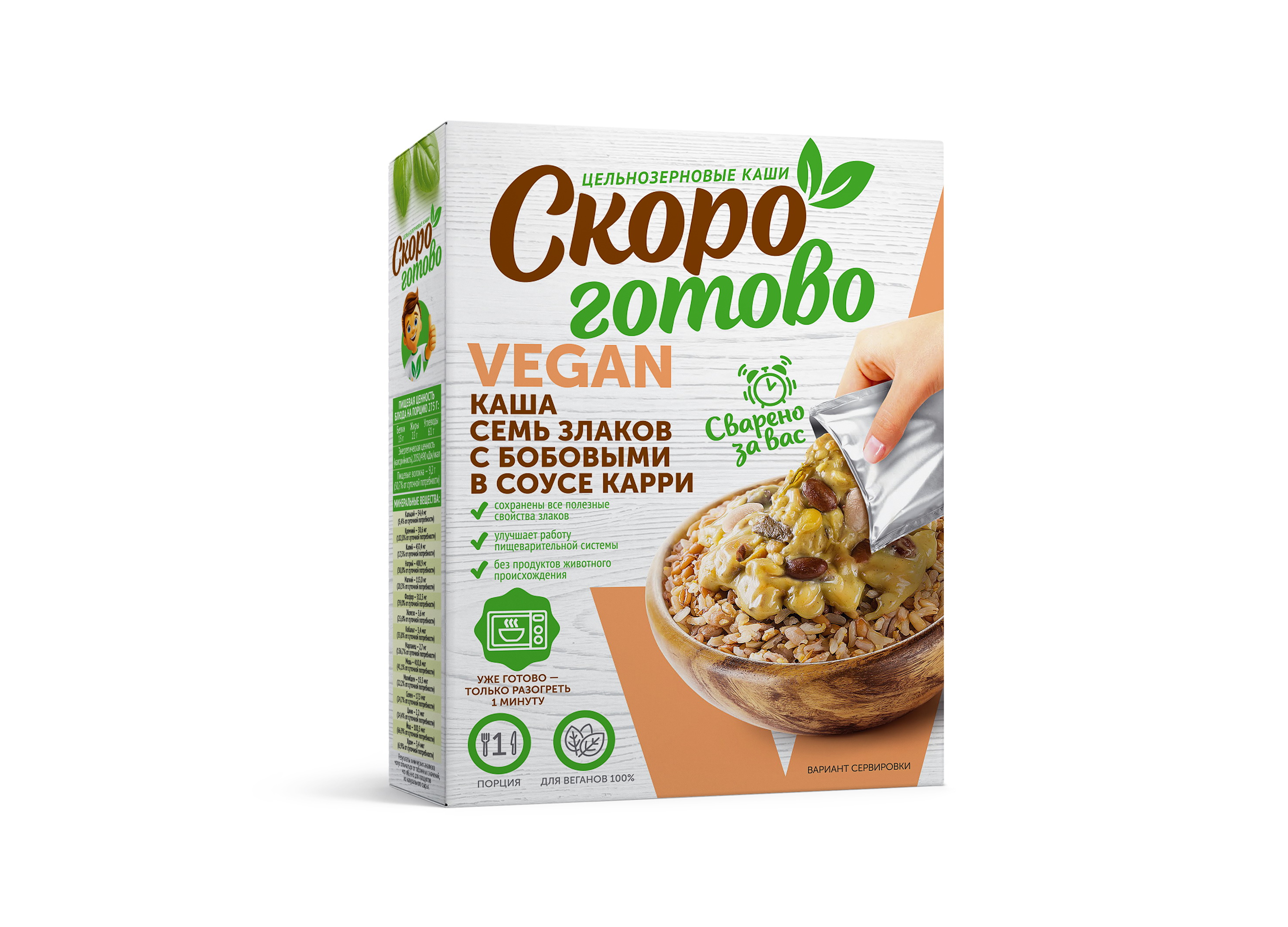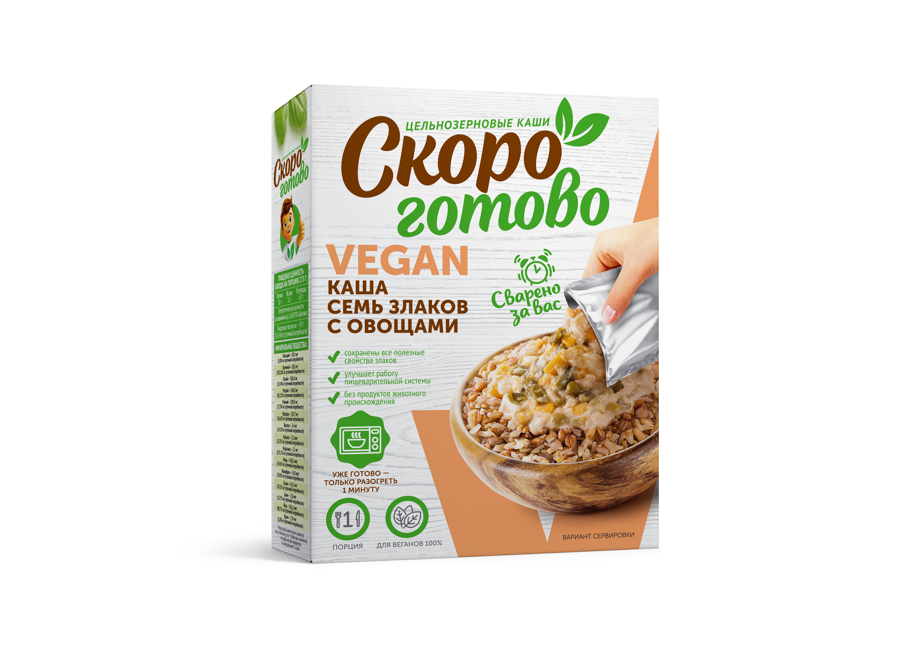 Цельнозерновые каши и супы-пюре, вторые блюда "Скоро готово" vegan - это новый формат уже готовых блюд для здорового питания в индивидуальной упаковке. Блюда, приготовленные без ингредиентов и пищевых добавок животного происхождения, без консервантов с сохранением всех полезные свойств натуральных ингредиентов, благодаря уникальной технологии бережной обработки паром.Приготовление цельнозерновых многозлаковых каш, супов-пюре, сытных вторых блюд в домашних условиях - это трудоемкий и длительный процесс и мы решили эту задачу за вас.