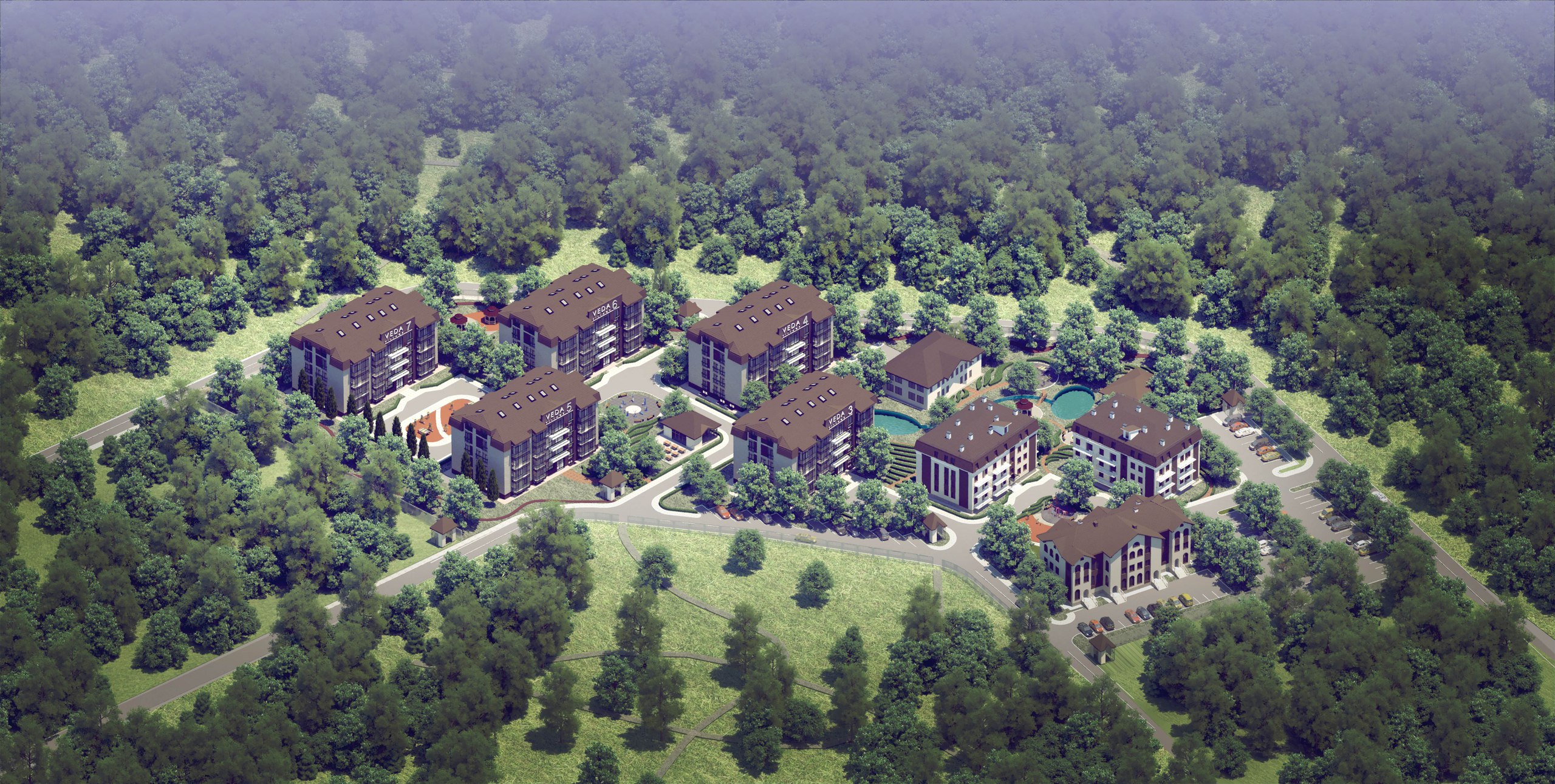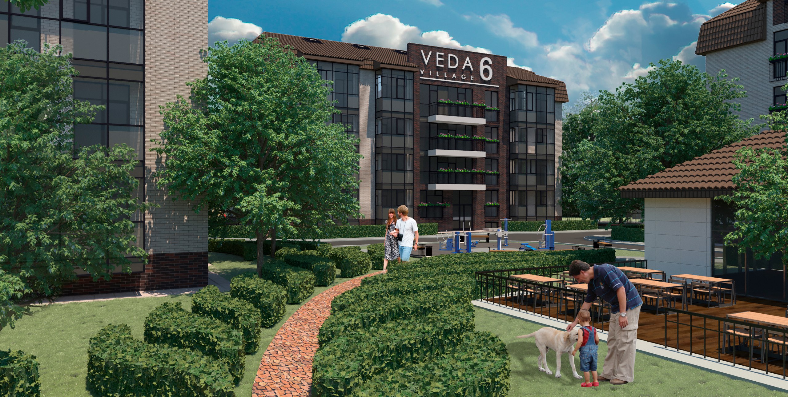 Veda Village застраивается четырехэтажными домами, в каждом из которых находится чуть больше 30 квартир. Сейчас идет возведение третьего корпуса.